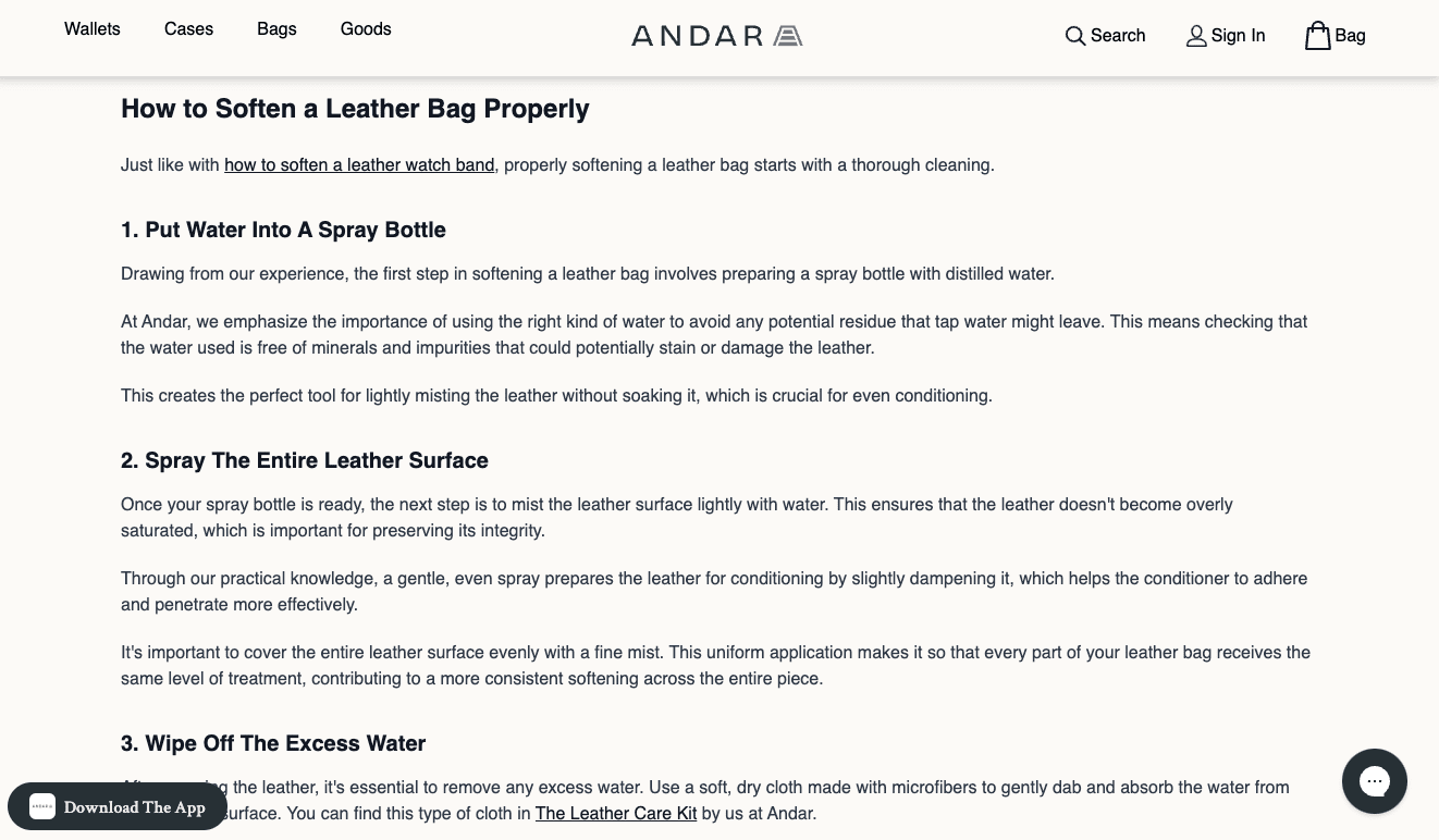 Andar’s How to Soften a Stiff Leather Bag article is a great example of a post-purchase piece of content meant to boost customer experience. It addresses a common pain point experienced by people who have invested in new leather products. It then presents Andar’s customers with simple and safe ways to treat their leather items in a way that matches their expectations, and shows their benevolence through offering support beyond the purchase.
