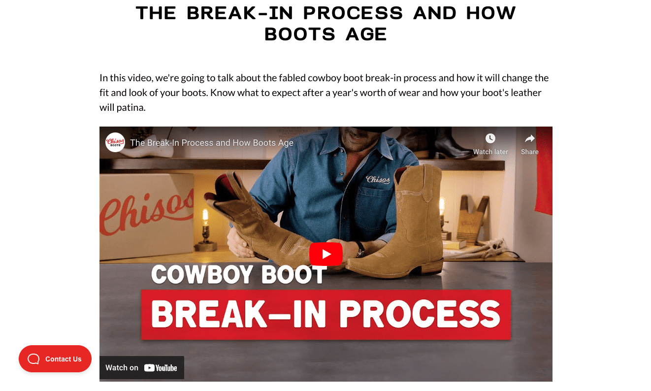 If you want to make your customer support content even more engaging, take inspiration from Chisos. Instead of just publishing blog posts, this business understands that most consumers prefer multimedia. That’s why it adds a video element to each of its product care guides, taking buyers through every single step of breaking into their brand-new cowboy boots.