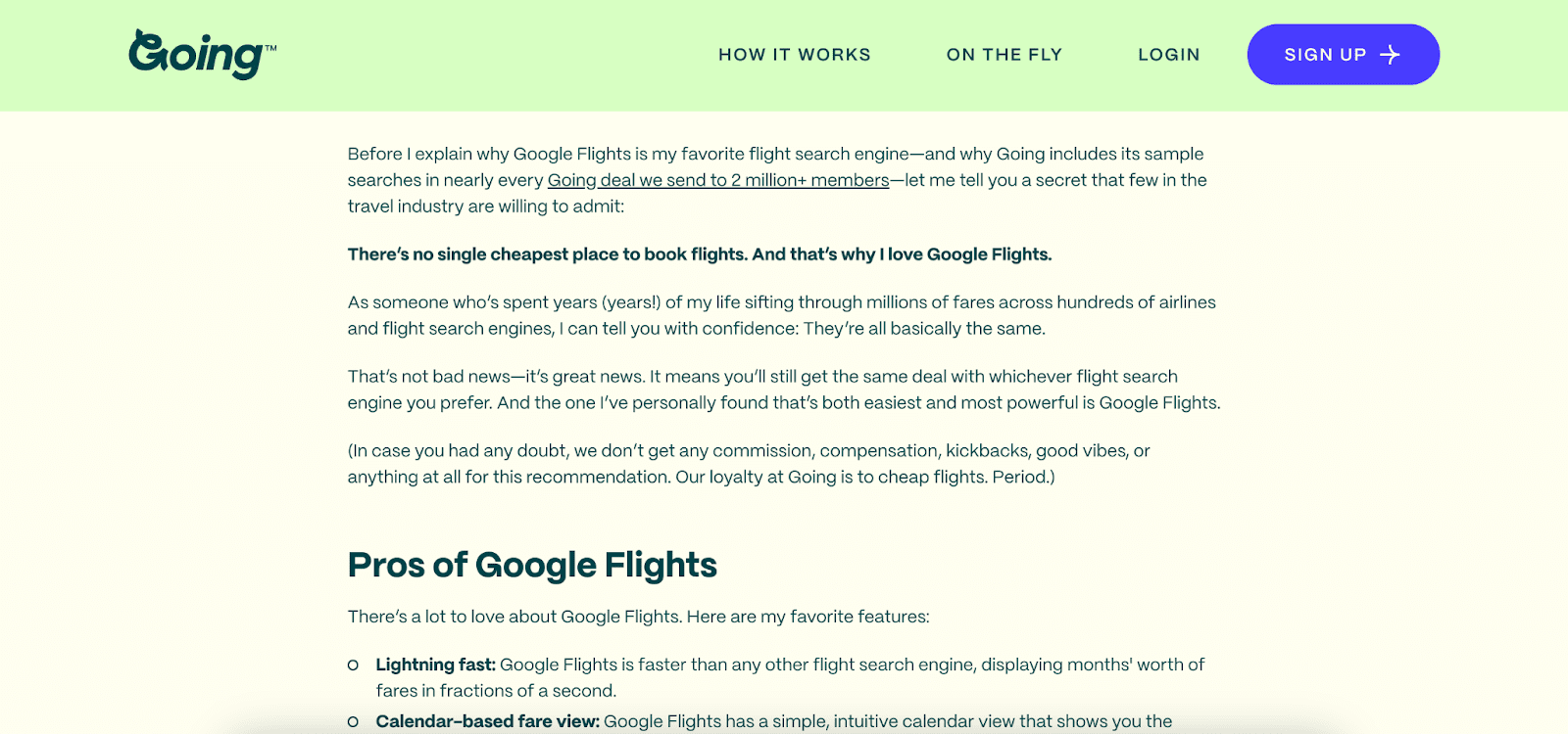 This is precisely what Going does with its How to Use Google Flights article. By presenting readers with tons of genuinely helpful information on how to find affordable airfare, the brand establishes itself as a trustworthy business. More importantly, it creates an opportunity to present its solution as a simpler alternative to Google Flights for budget travelers, seamlessly moving prospects from the top to the bottom of the sales funnel with a single post.
