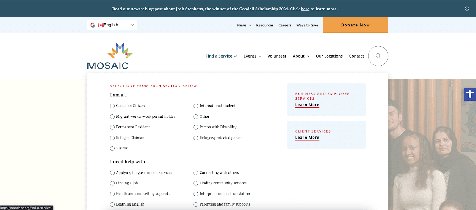 You can see a non-profit example of this same enhanced experience with MOSAIC’s website. They offer many services for immigrants, so to help them find the content they need more easily, they offer a service finder that generates results based on the user’s chosen settings.