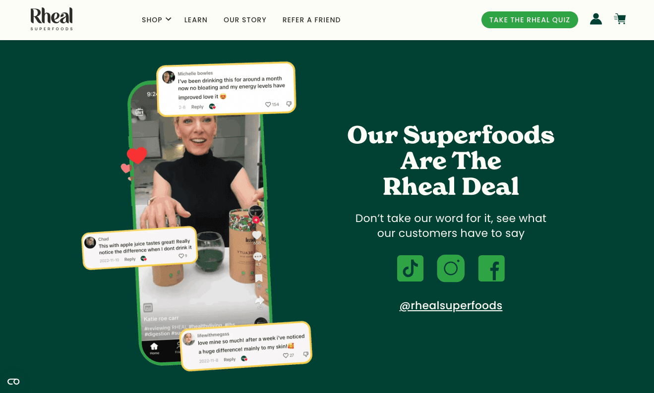 For example, incorporating user-generated content in your website design, like in the below example from Rheal, is a great way to show off social proof.