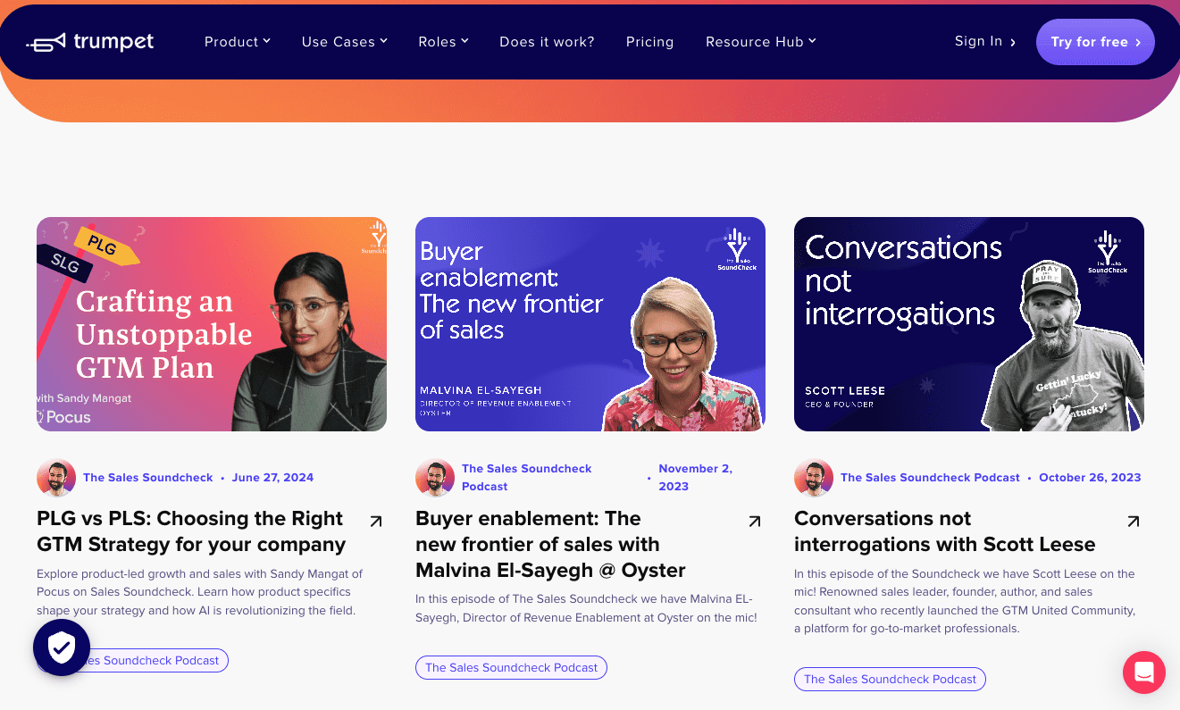 For a great example of what you could do, check out how Trumpet uses content to demonstrate expertise. In The Sales Soundcheck Podcast, Trumpet’s CEO interviews sales leaders, bringing unique insights to the brand’s future customers. The outcome of such an expert-led approach is twofold. For one, thanks to the insights and expertise of the guests on the show, listeners/viewers can gain immense knowledge and value from each episode. Secondly, the brand’s CEO also demonstrates a deep understanding of the sales process, establishing his (and, by proxy, his brand’s) competence, and automatically enhancing customer trust.