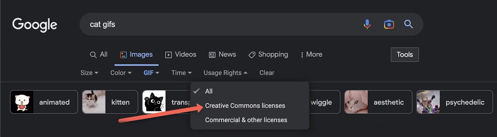 You can also stick to searches for GIFs that have creative commons or commercial licensing: