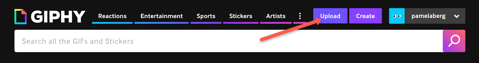 I’ll use Giphy as an example. Create an account, then click ‘upload’.