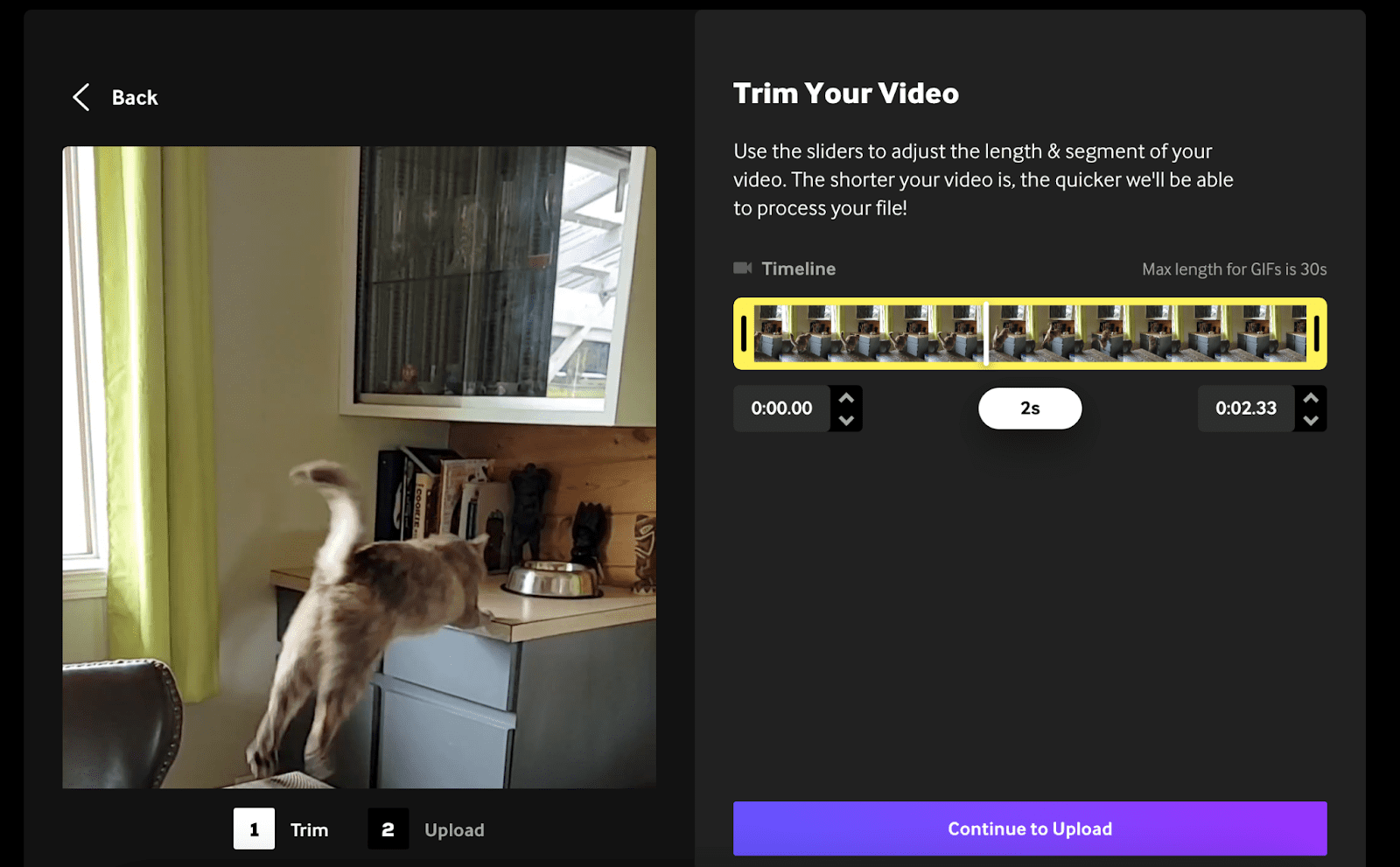 I uploaded a two-second video of my cat that I took with my phone. Easy-peasy. Then it asks me if I want to trim the video. It’s only two seconds, so that’s a no.