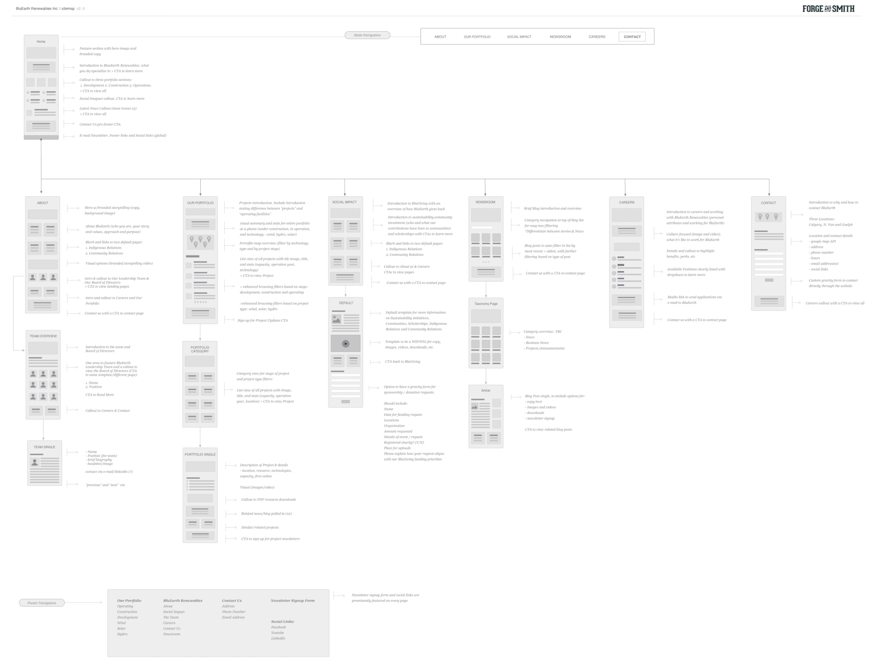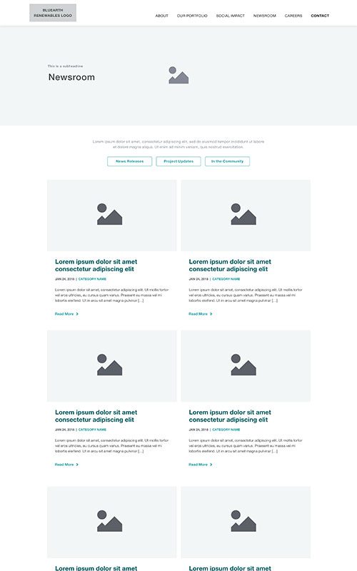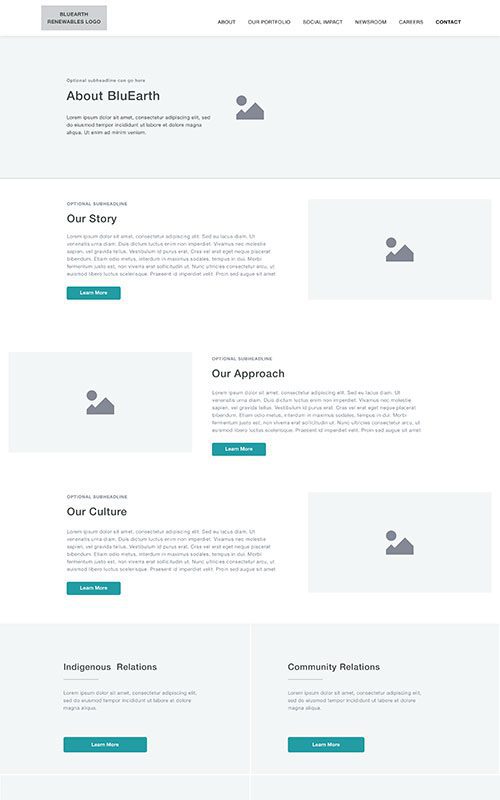 BluEarth has a diverse audience, ranging from investors and government employees to land owners, First Nations peoples, potential recruits, and media. The website redesign needed exceptionally strong information architecture and navigation, with clear paths to key content for each audience. Improving the content flow was our key objective in initial sitemaps and prototyping.