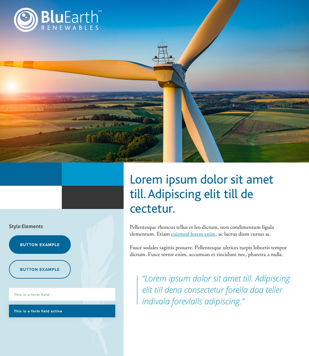 BluEarth already had a great brand style, and we wanted to preserve that in the new web design. We worked with a palette of blues contrasted with dark grey and white, and added fresh, modern typography. With all the new and improved content areas, we were able to create more room for striking photography to better tell their story. The overall feel is clean and open, which reflects their purpose and work.