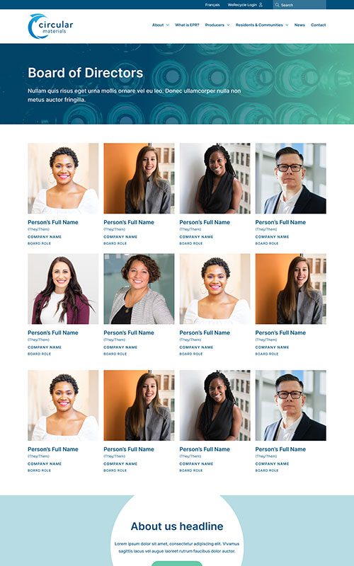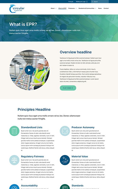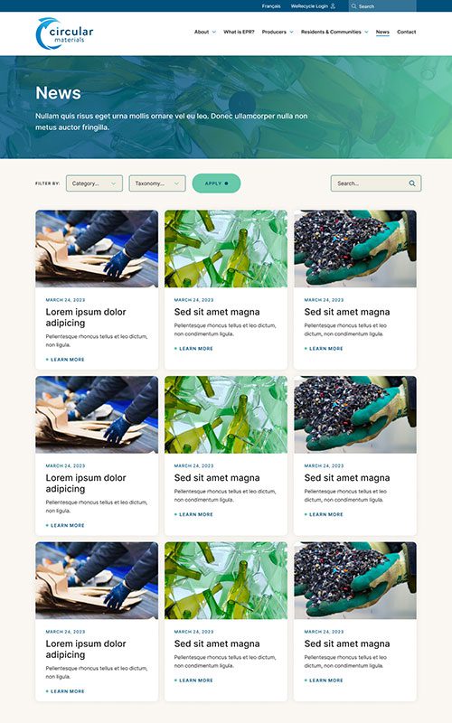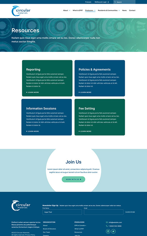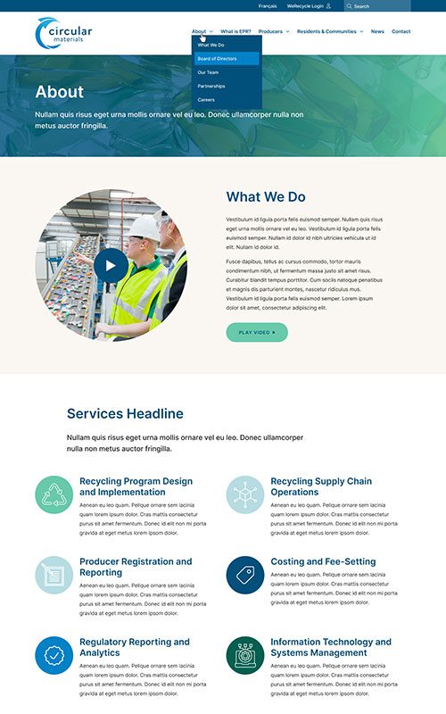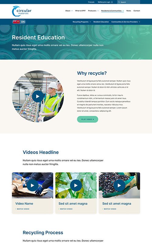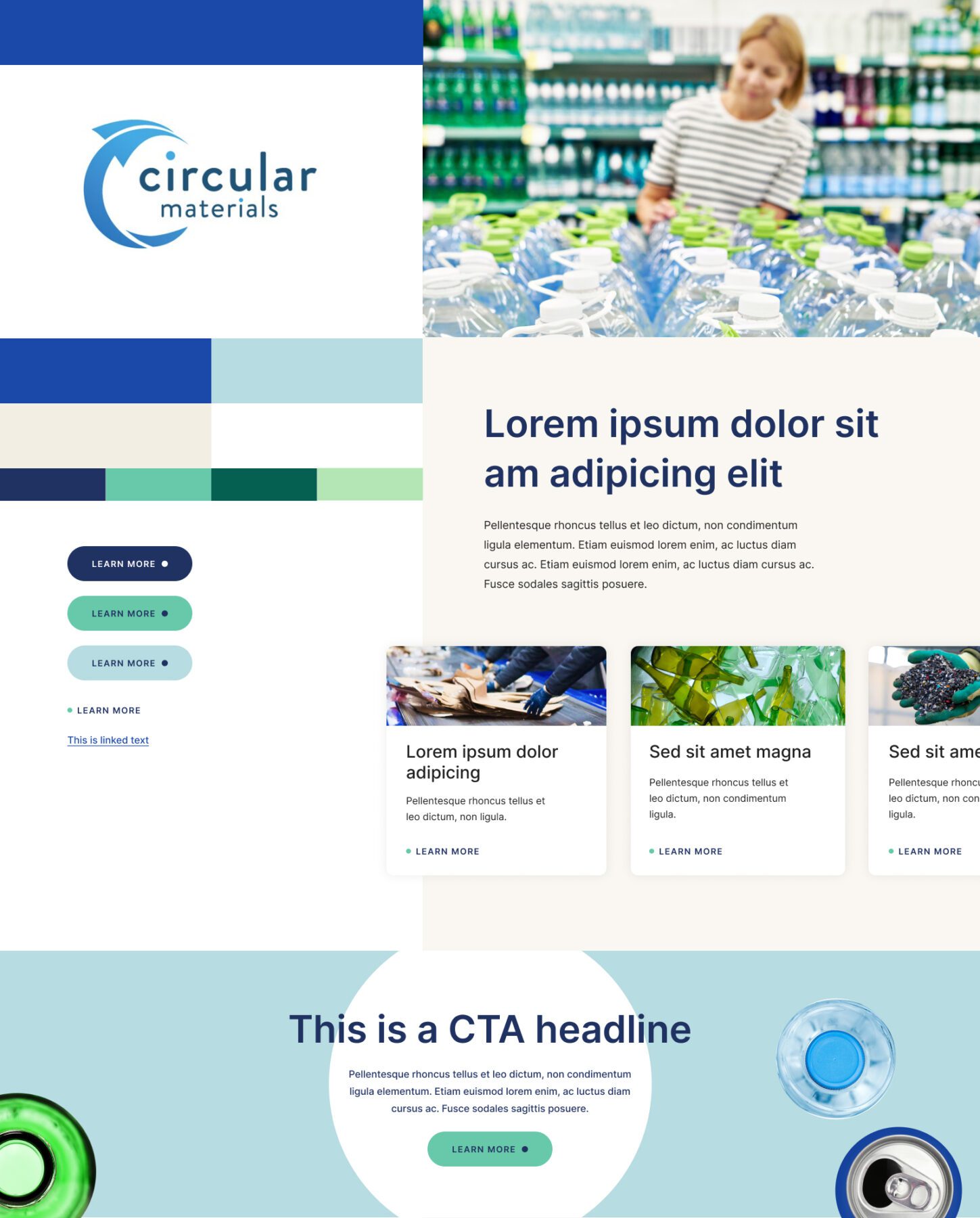 Circular Materials had strong branding in place, and a clear vision of how they wanted to apply it to their new website. Combining public needs and industry standards, styling the site involved creating page layouts and elements that would deliver a visually appealing experience while maintaining AODA Level AA compliancy. We wanted the overall look and feel to be slightly earthy and organic, while still evoking professionalism.