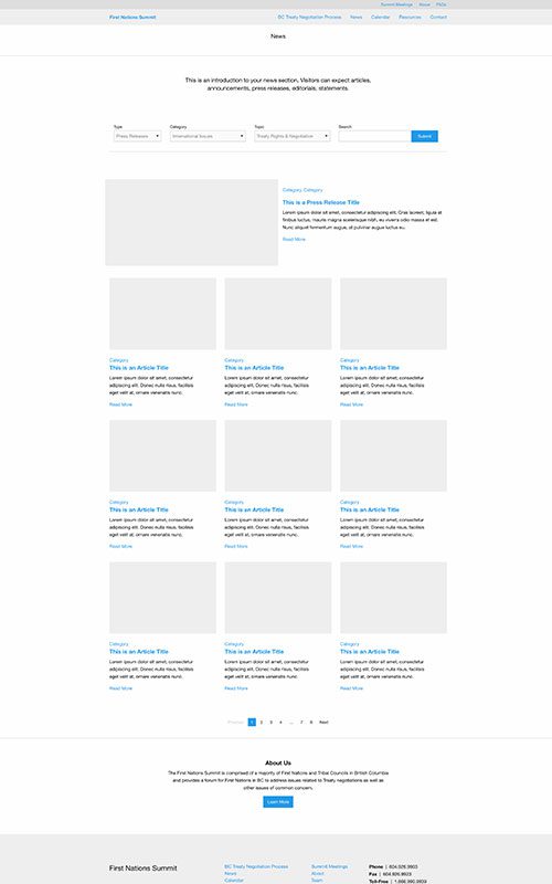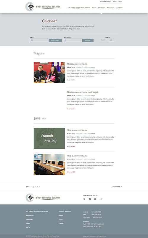 For the First Nations Summit, we wanted to make a site that was as equally engaging as it was informative. First-time users and band members should immediately feel like they have the appropriate information and tools to participate in the BC treaty process. This is why we focused on creating an easy-to-navigate events calendar and a searchable Resources page.
