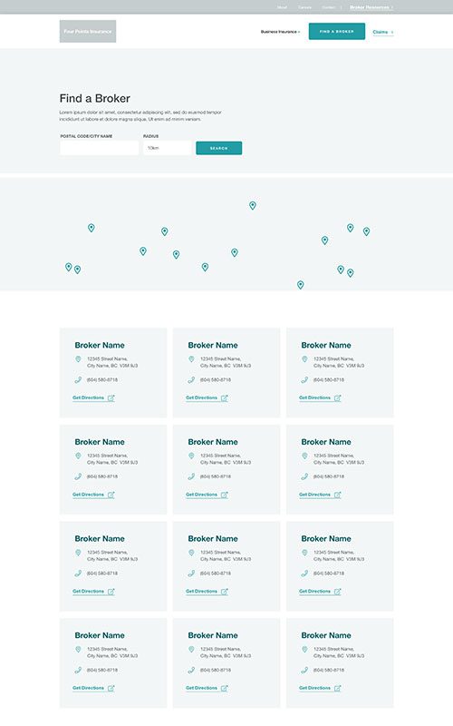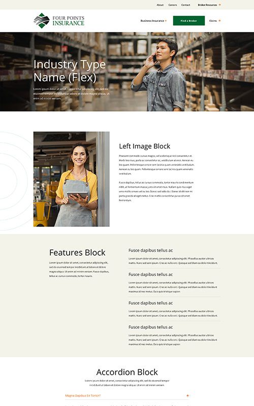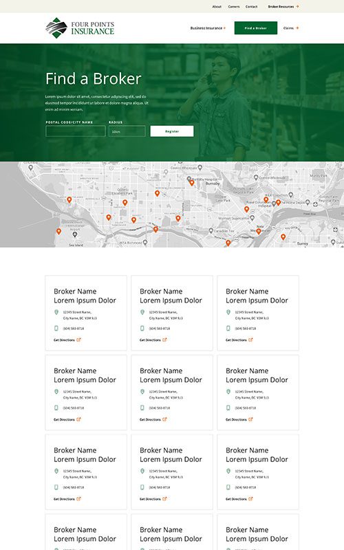 The new Four Points Insurance site features a gated broker login area that filters access to resources and contacts based on a broker ID. Product offerings are now filterable by both industry and type, and clear pathways point potential clients to the Find A Broker page where brokers appear filtered by location.