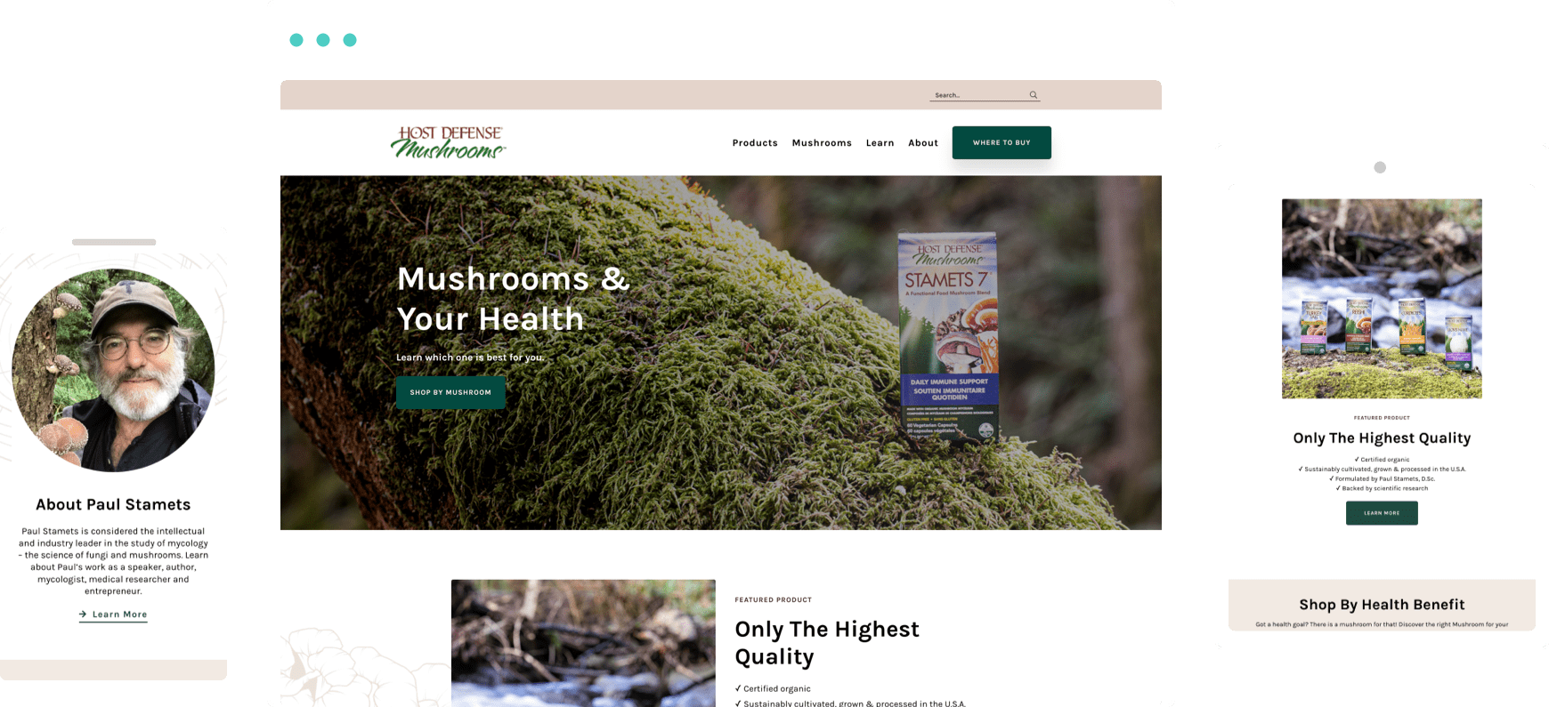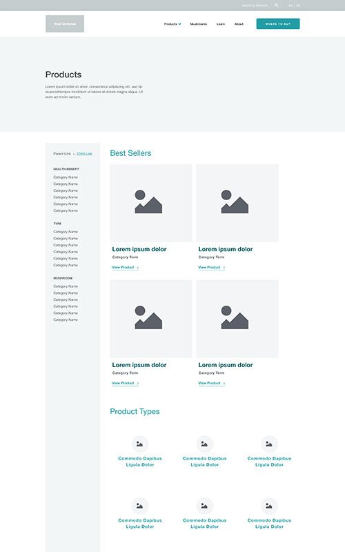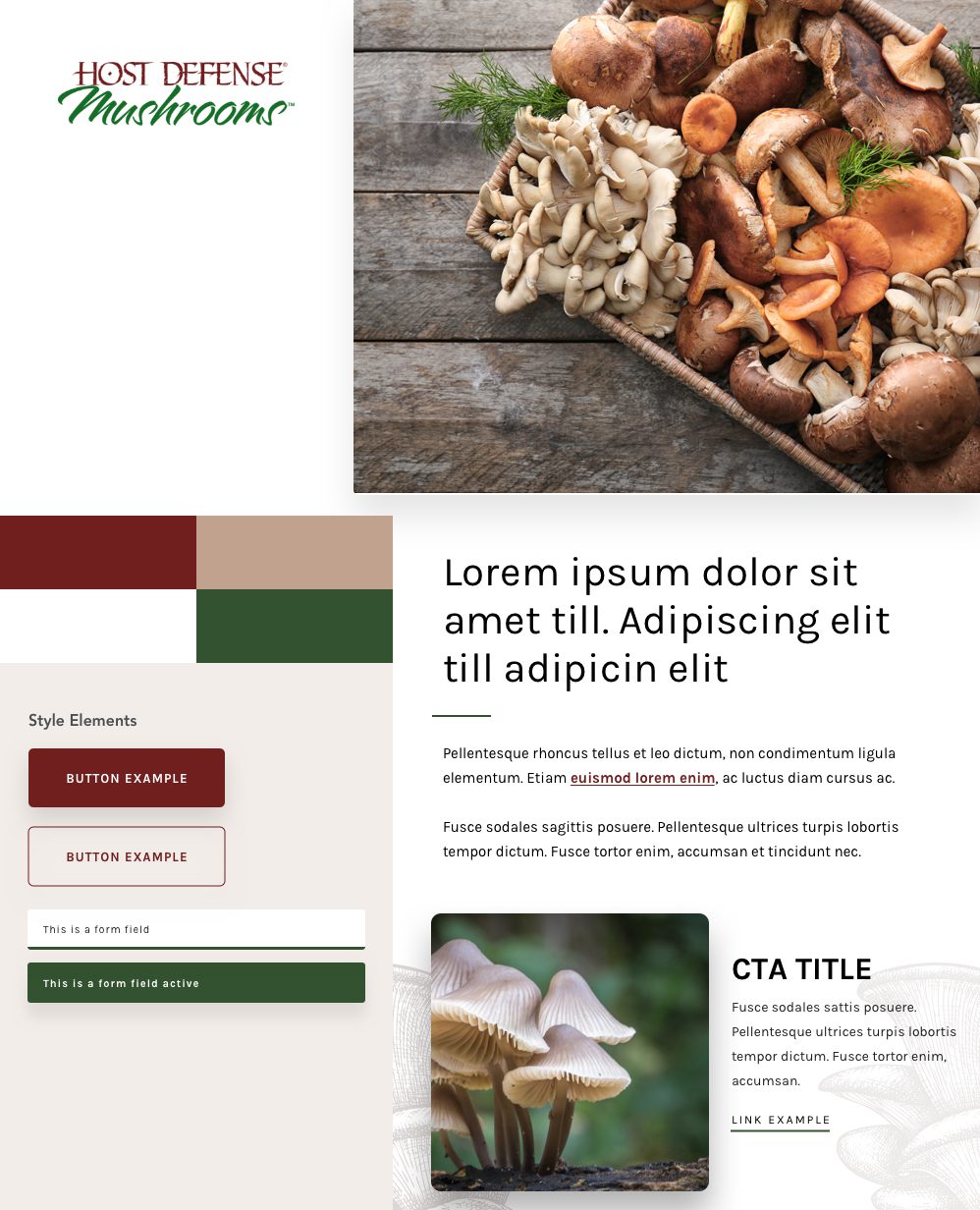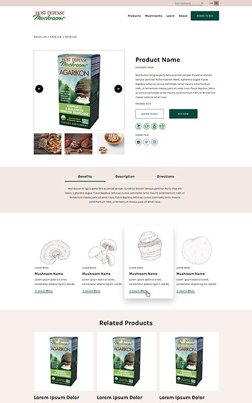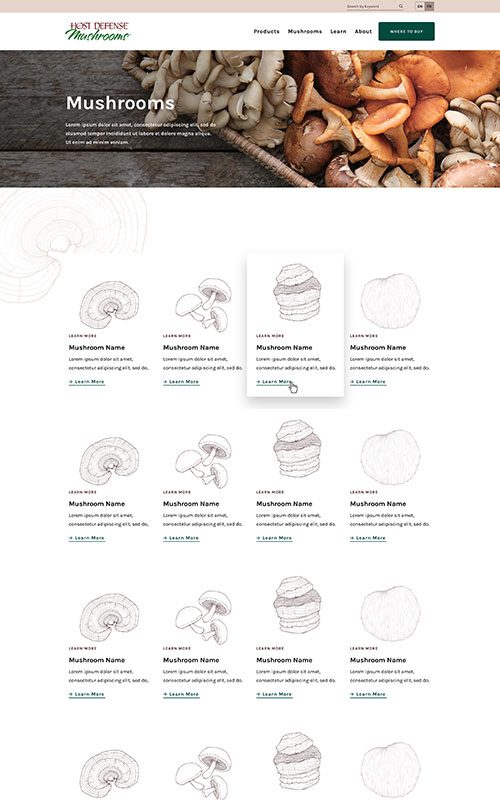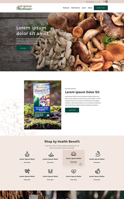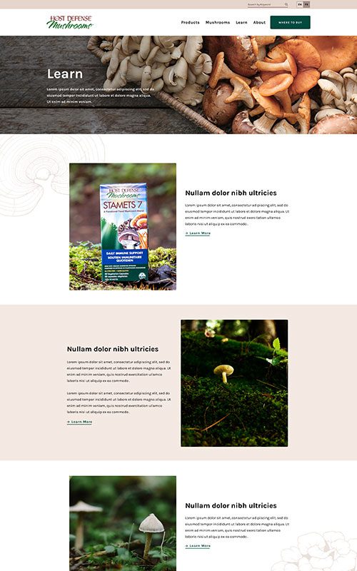 Host Defense has a rich, earthy palette of browns and greens. We added greys and darker overlays to evoke the feeling of foraging in a forest. Coupled with new illustrations and icons, the resources and products are elevated – but remain on-brand with the US site’s content.