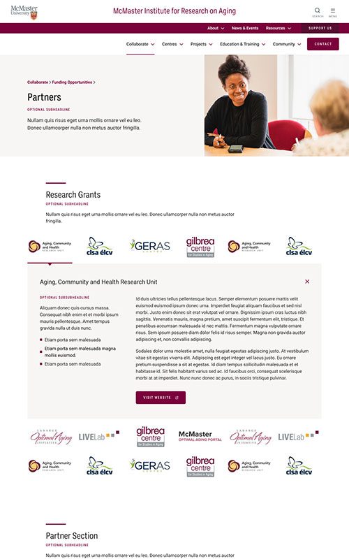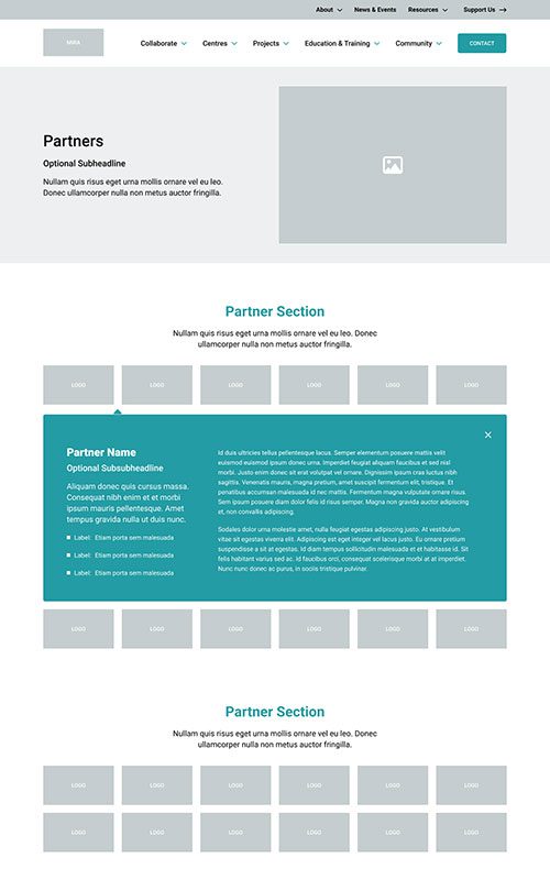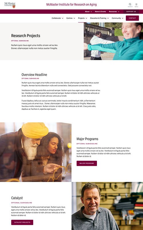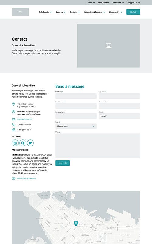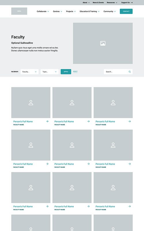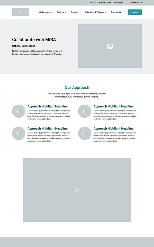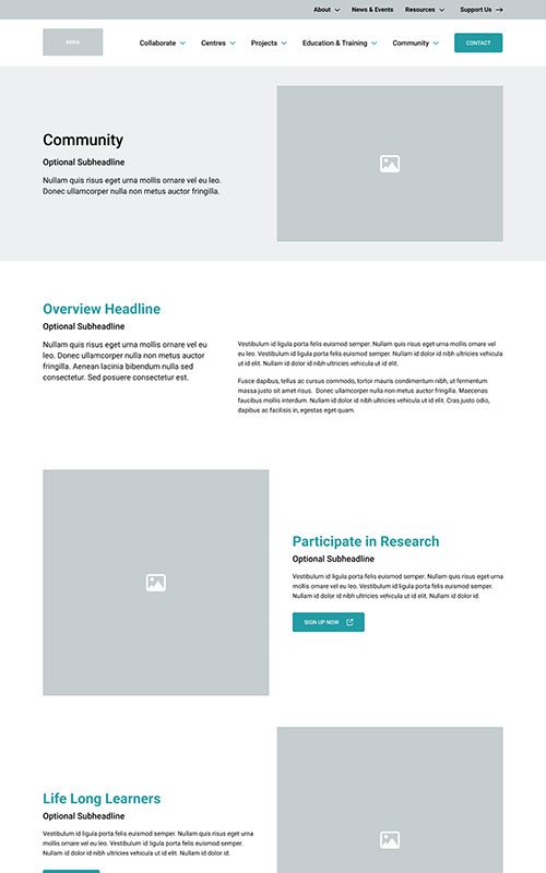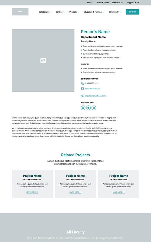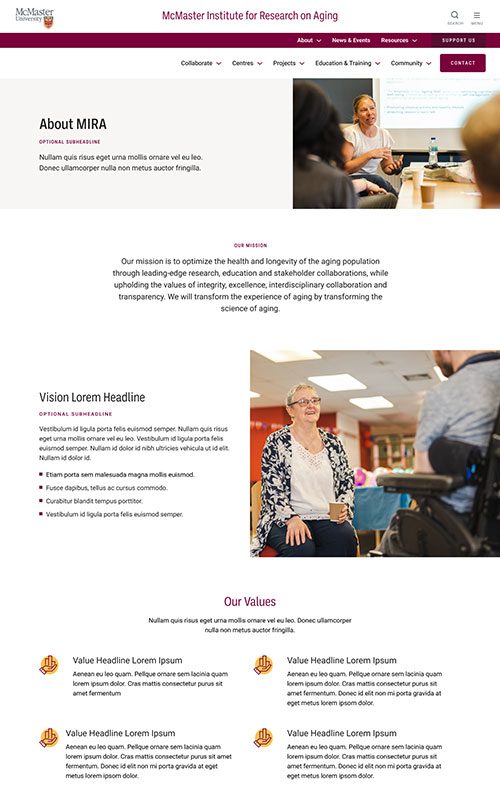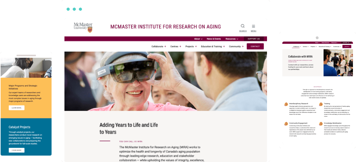 The new MIRA site needed to maintain their existing branding, to remain unified with the main McMaster University site. We made sure to match the parent site’s spacious layouts and bold use of photography. We also worked with their palette to add some fun colour blocks into the page designs, so the site has just a hint of its own unique feel.