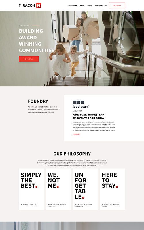 It was a no-brainer that this web design needed to put their stunning photography front and centre. Being able to explore attractive exterior and interior photos as well as floor plans would create an emotional reaction for website visitors. The new look and feel is clean and spacious like their communities, with vivid red accents to draw the eye to key actions like CTA buttons.
