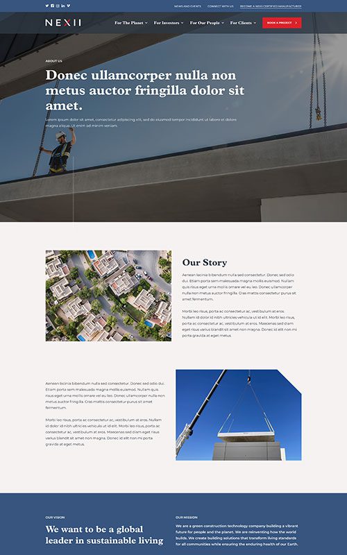 Nexii’s old site was text-heavy, which detracted from the company’s innovative personality. We wanted to create a design that uses strong visual storytelling to showcase their impact. With more space for recognizable photos of cities and buildings, website visitors immediately grasp the scope of their team’s capabilities.