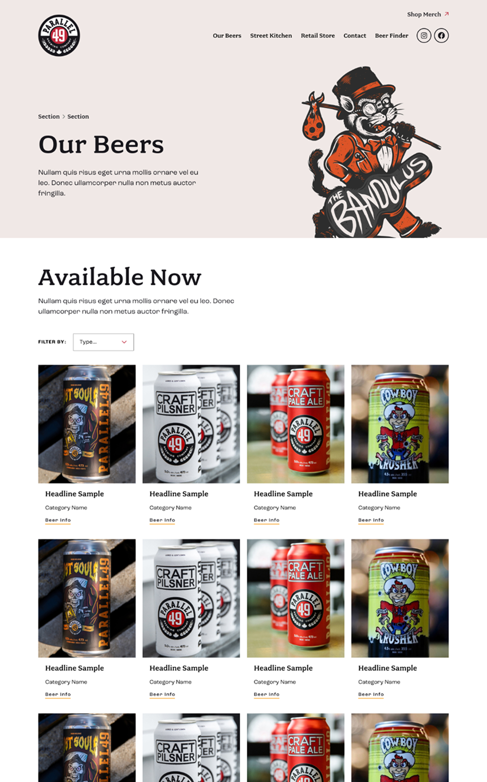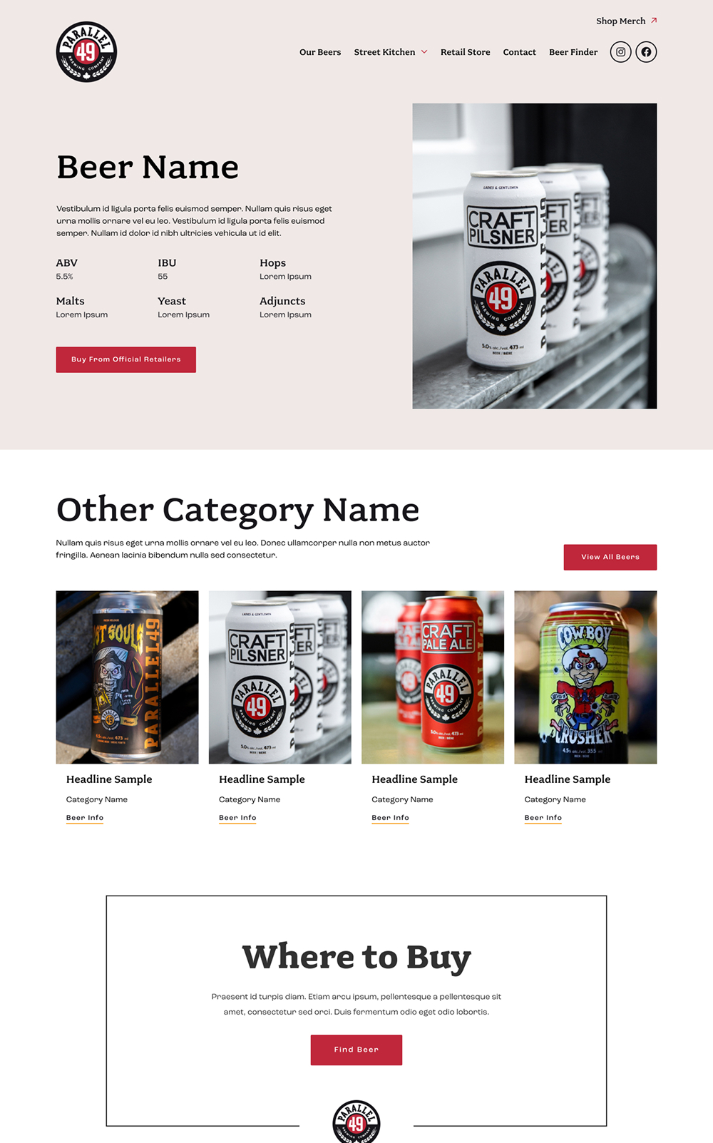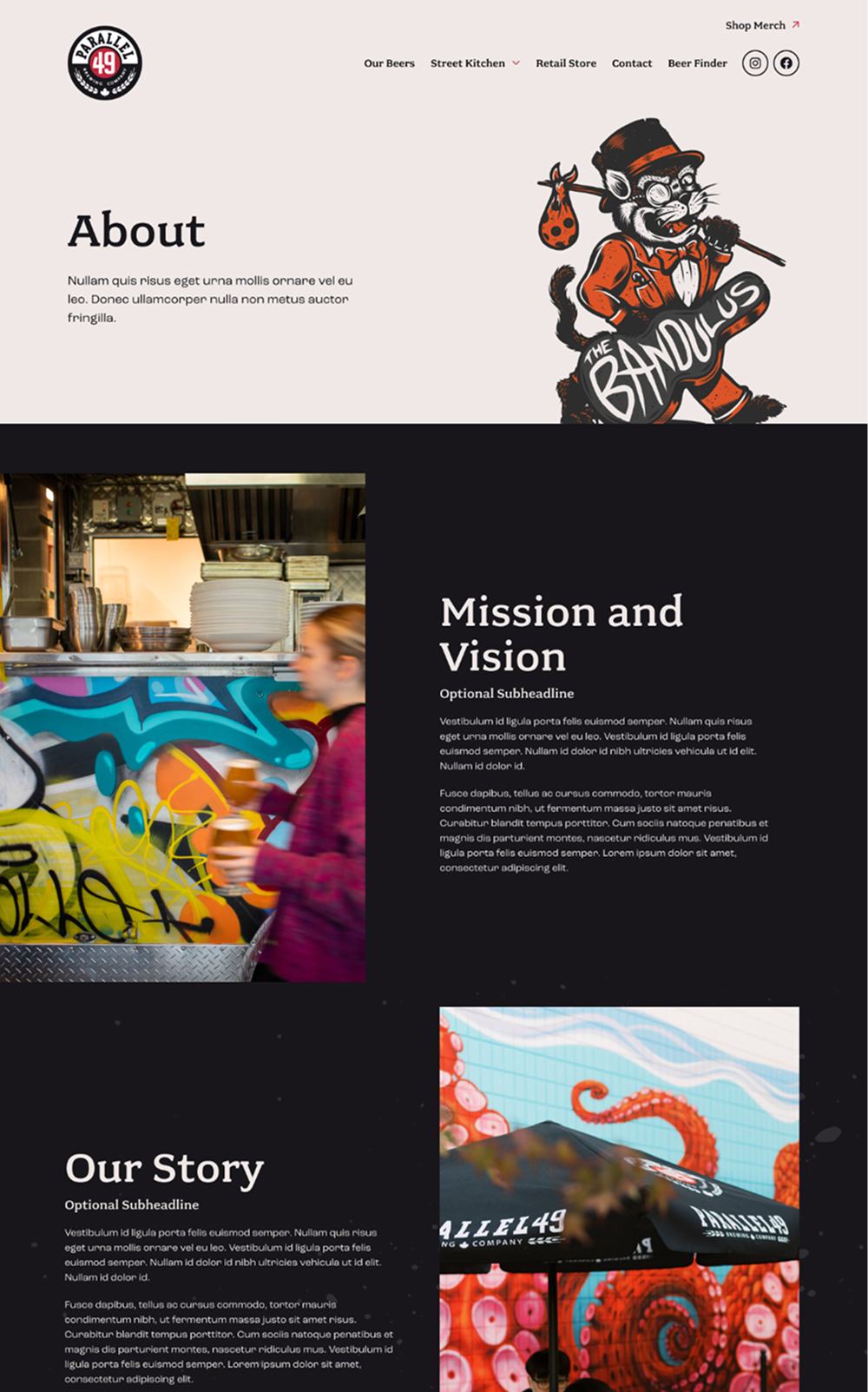 Cans of P49 beer have bold artwork that radiates an East Van vibe. We used starkly contrasting dark and light backgrounds with lots of white space, to draw a visitor’s eye to the bright colours on key content and callouts. Serifed fonts emulate their logo, tying all of the visuals together.