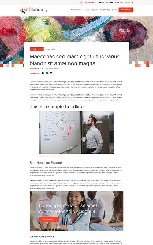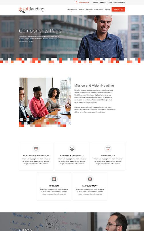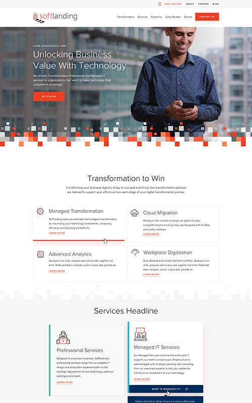 Softlanding already had well-known branding. We used their existing palette of reds and greys, creating pixelated accents and backgrounds to give the site a fresh and unique feel. Each page now features bigger images and more white space, creating a more inviting experience. The Case Studies and Blog pages in particular have stronger visual stories.