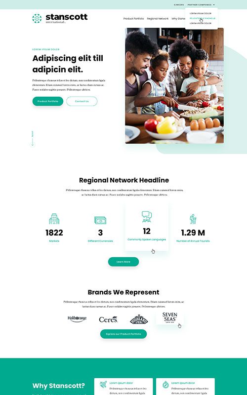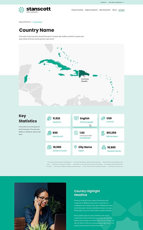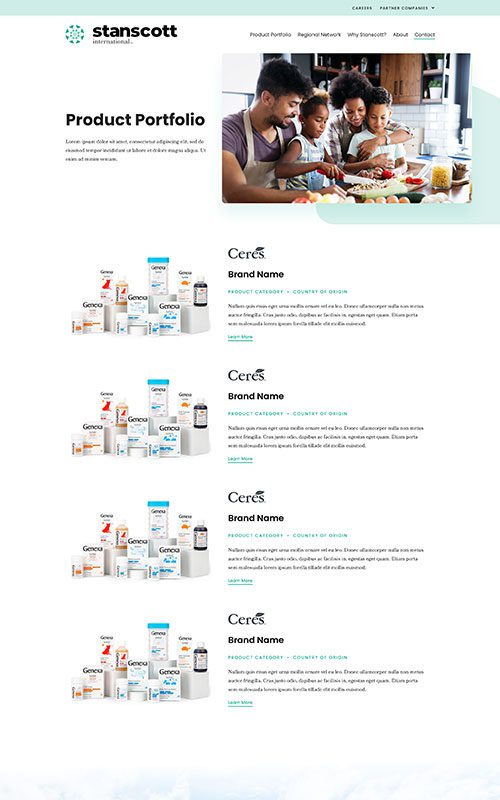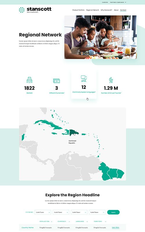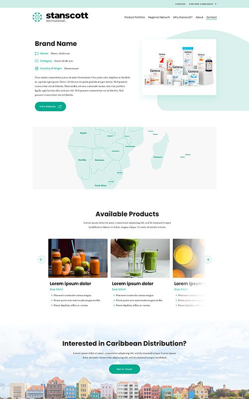 The new Stanscott website showcases available wellness products among welcoming imagery of the Caribbean and smiling health professionals. The regional network map allows for filtering by different data sets and access to individual country landing pages with relevant distribution information. Product brand landing pages display relevant facts such as country of origin, and available products smartly display images and info in scrolling form. The vibrancy and varied markets of the Caribbean are represented not only visually but in credibility-reinforcing facts and figures.