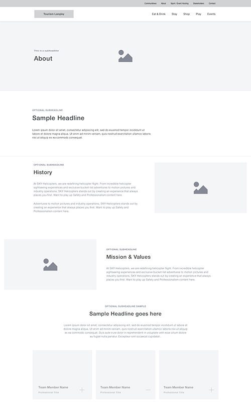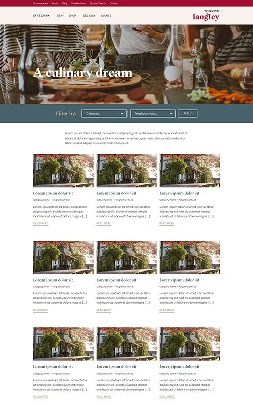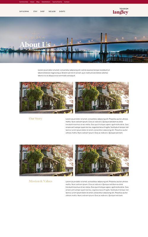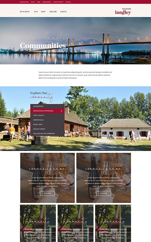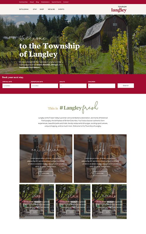 Tourism Langley had existing branding, which we enhanced to showcase the most important content: big, beautiful, high quality photographs. Each page design centred around the engaging imagery, drawing visitors to click and learn more about the shops, restaurants, festivals, sports, and wineries. Modern typography rounds out the website’s atmosphere of a must-see destination.