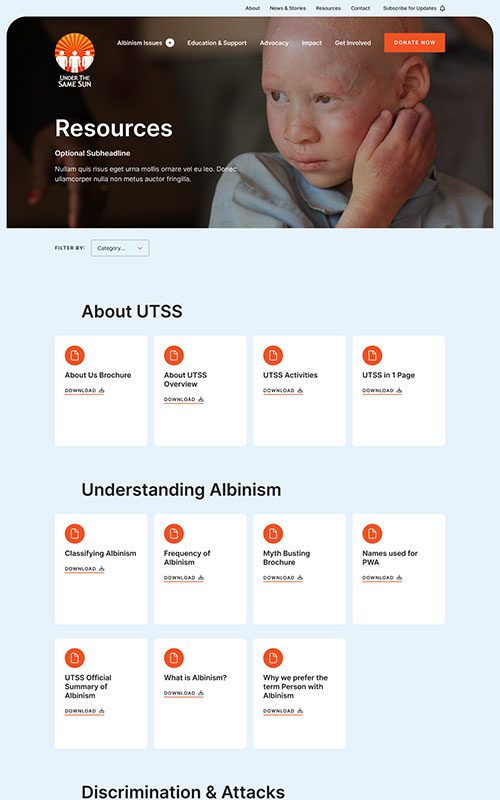 A long-established charity, Under the Same Sun already had an online presence. But their existing website was centred around a lot of technical and research content albinism issues in Africa, which was moved to a separate advocacy website.