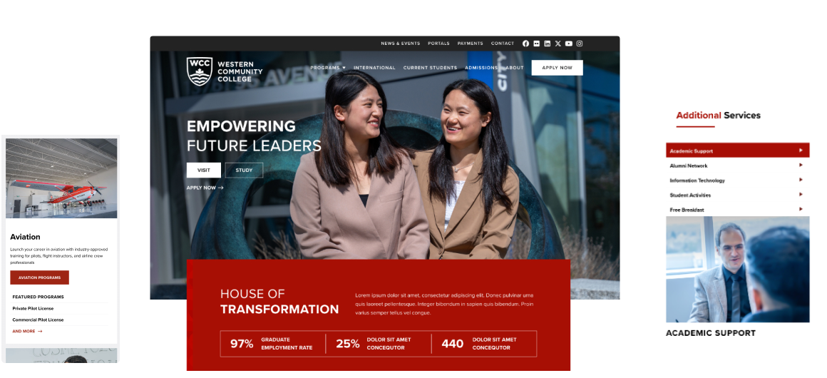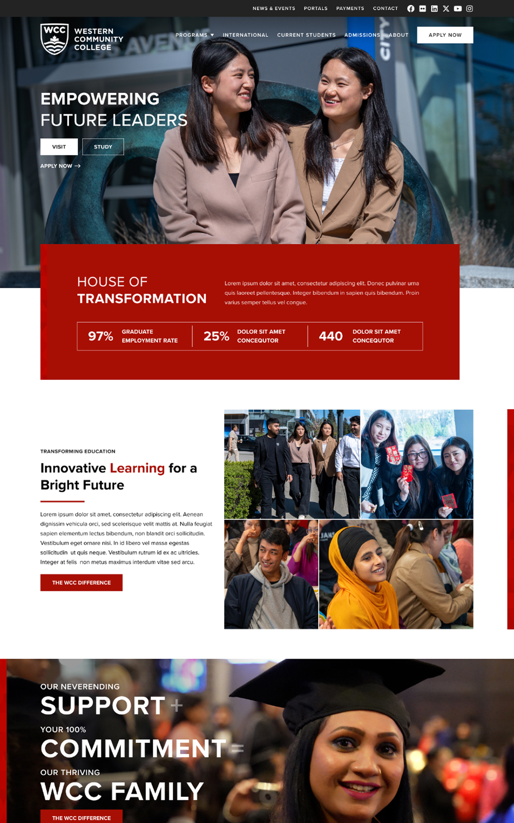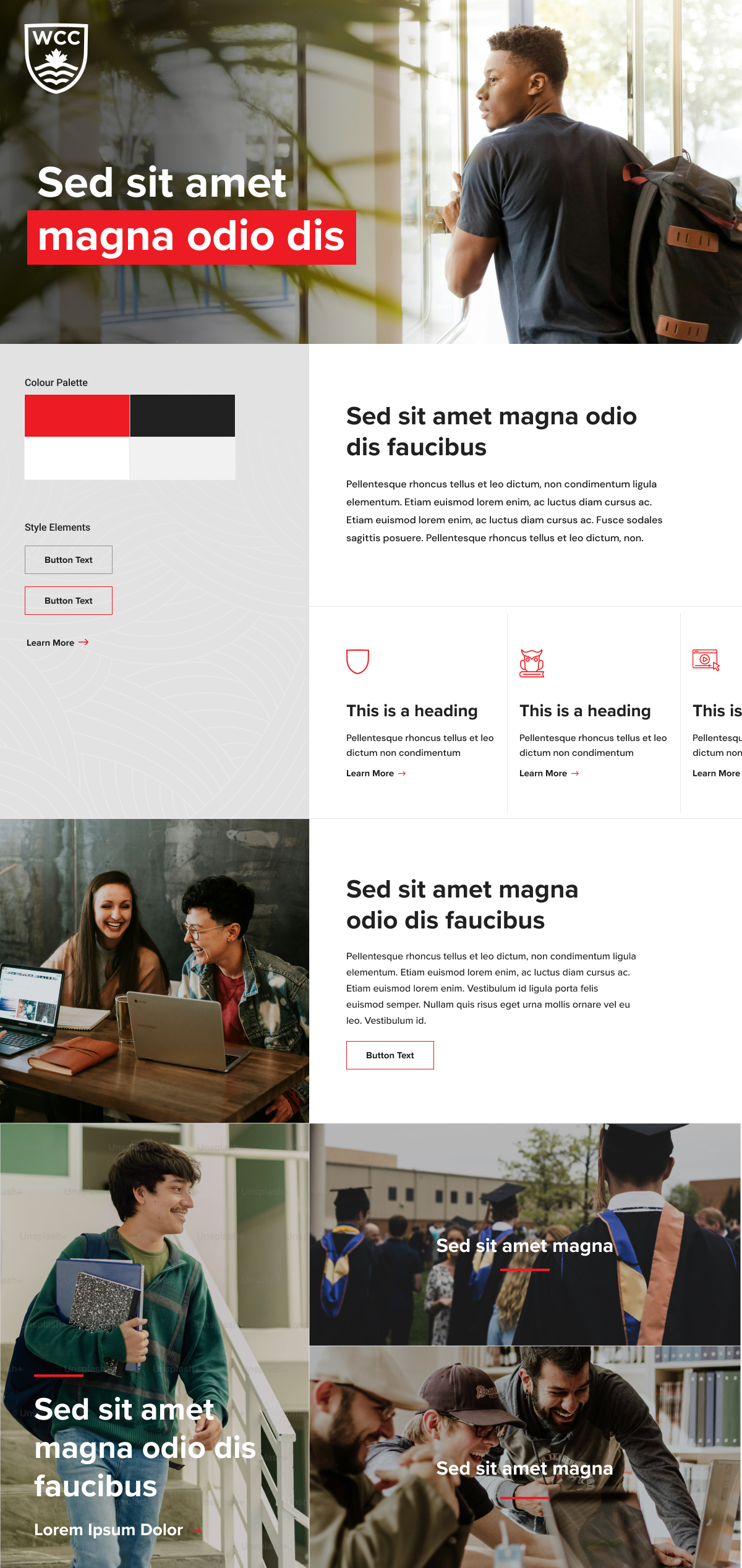 WCC was looking for a visual lift, leaning more into the red from their palette and going for a more minimalist aesthetic. We created designs with vivid background patterns and icons to make the pages feel more lively, without creating clutter. Their authentic photography throughout the site gives it the feeling of a spirited, exciting campus.