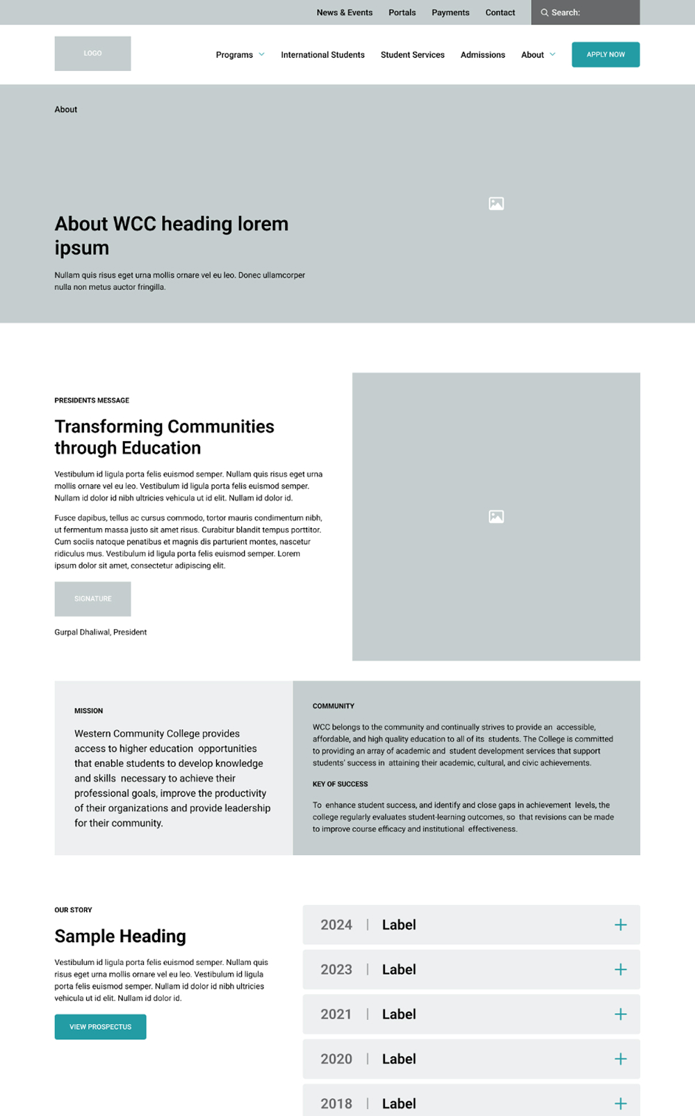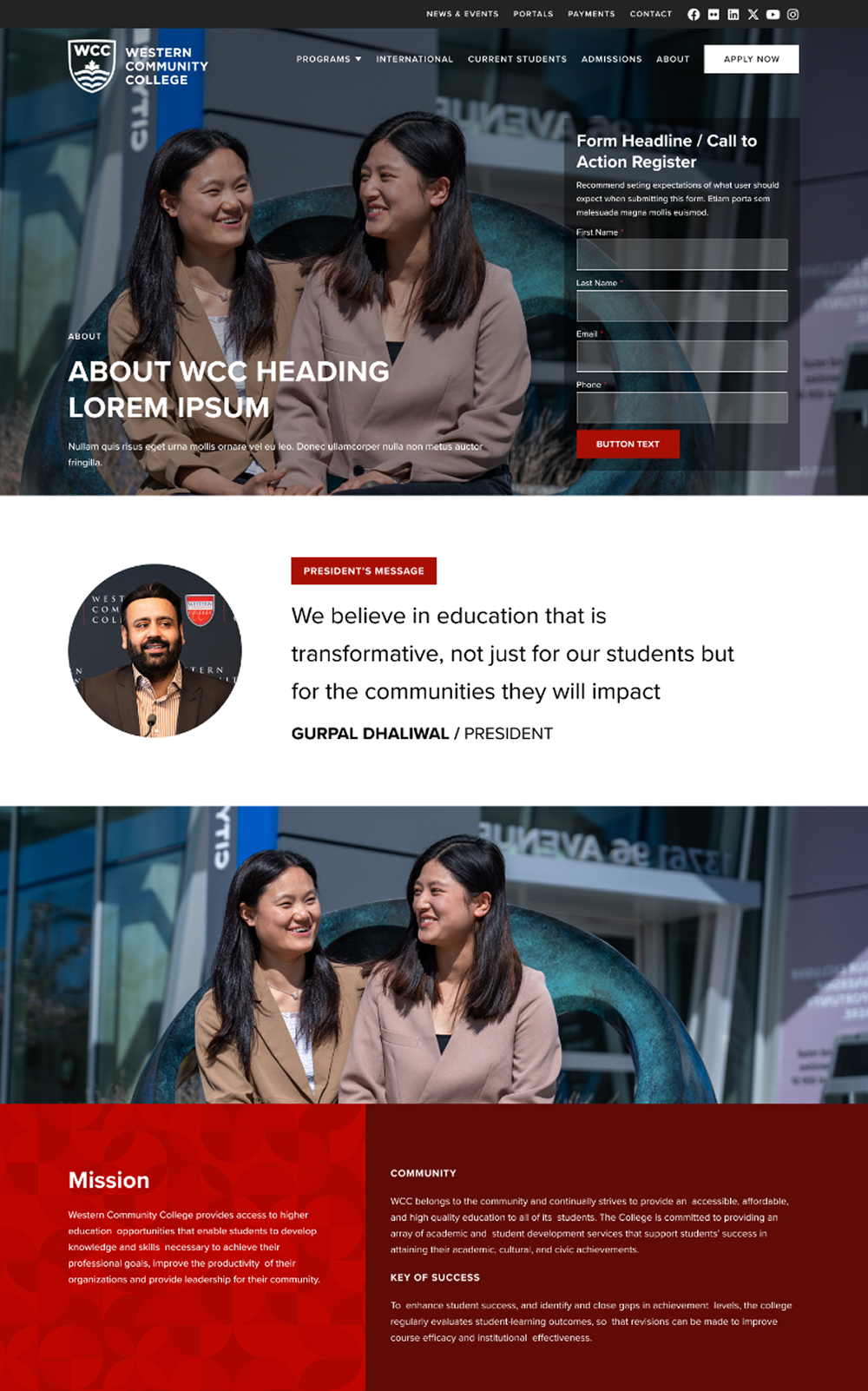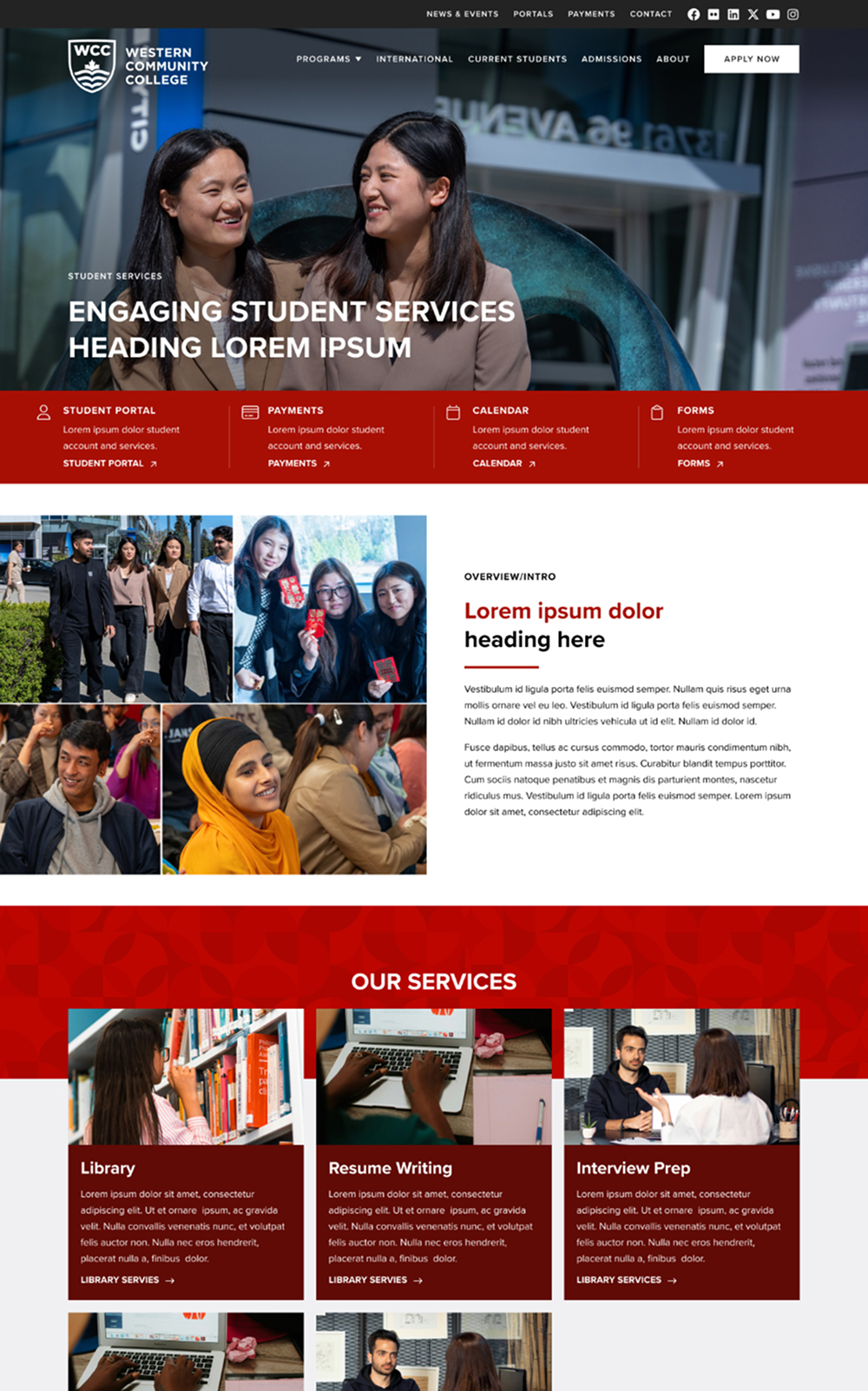 WCC was looking for a visual lift, leaning more into the red from their palette and going for a more minimalist aesthetic. We created designs with vivid background patterns and icons to make the pages feel more lively, without creating clutter. Their authentic photography throughout the site gives it the feeling of a spirited, exciting campus.