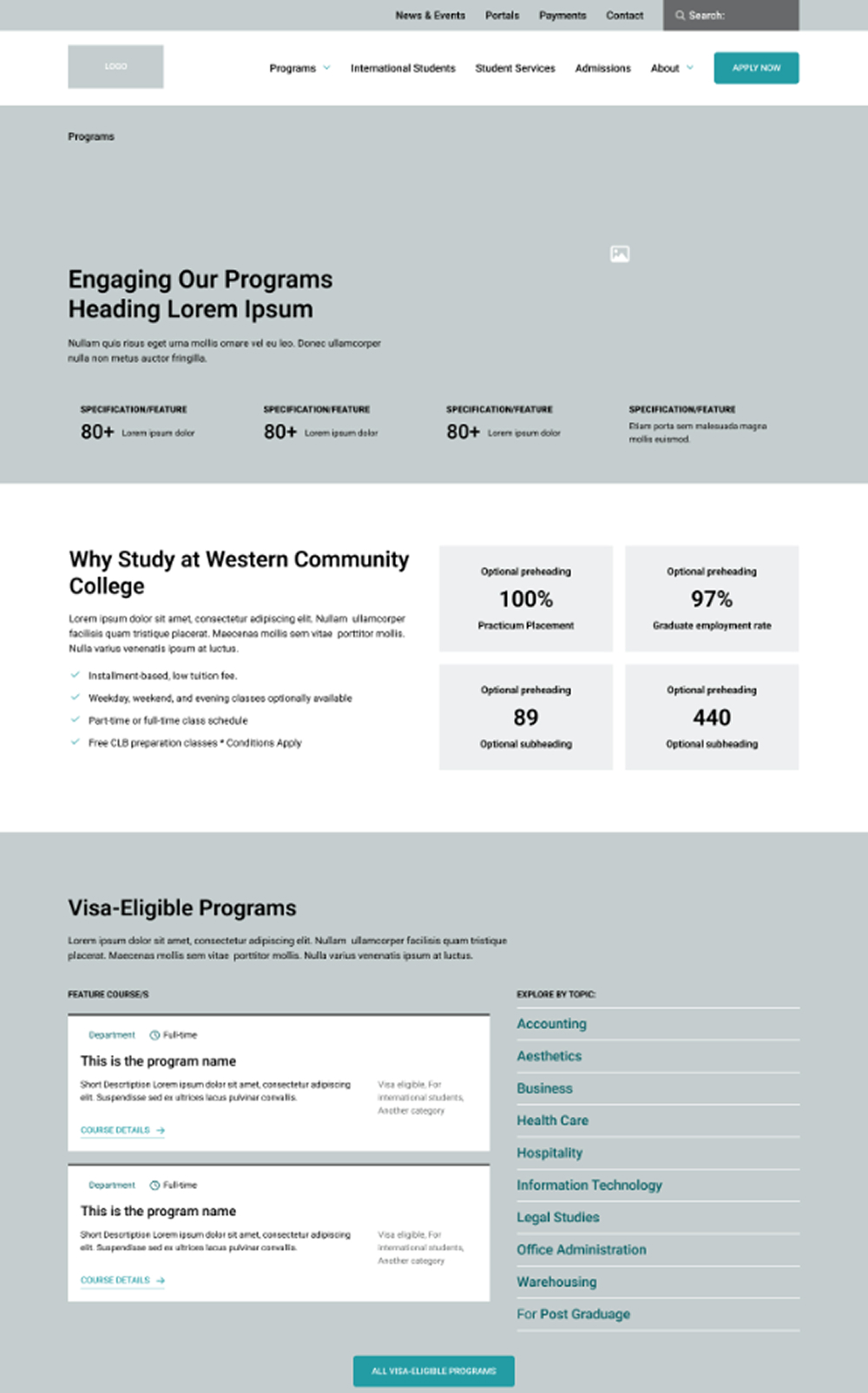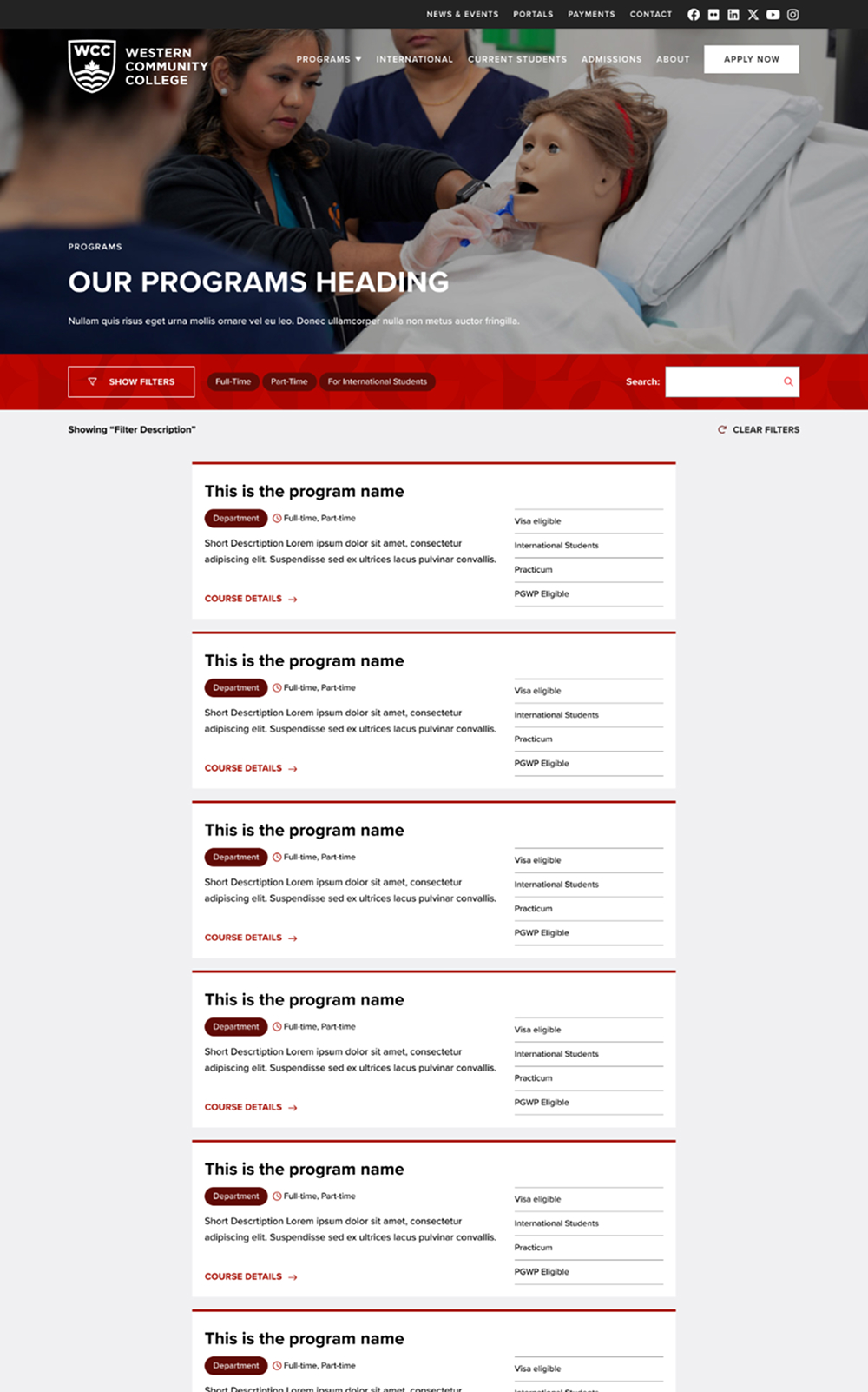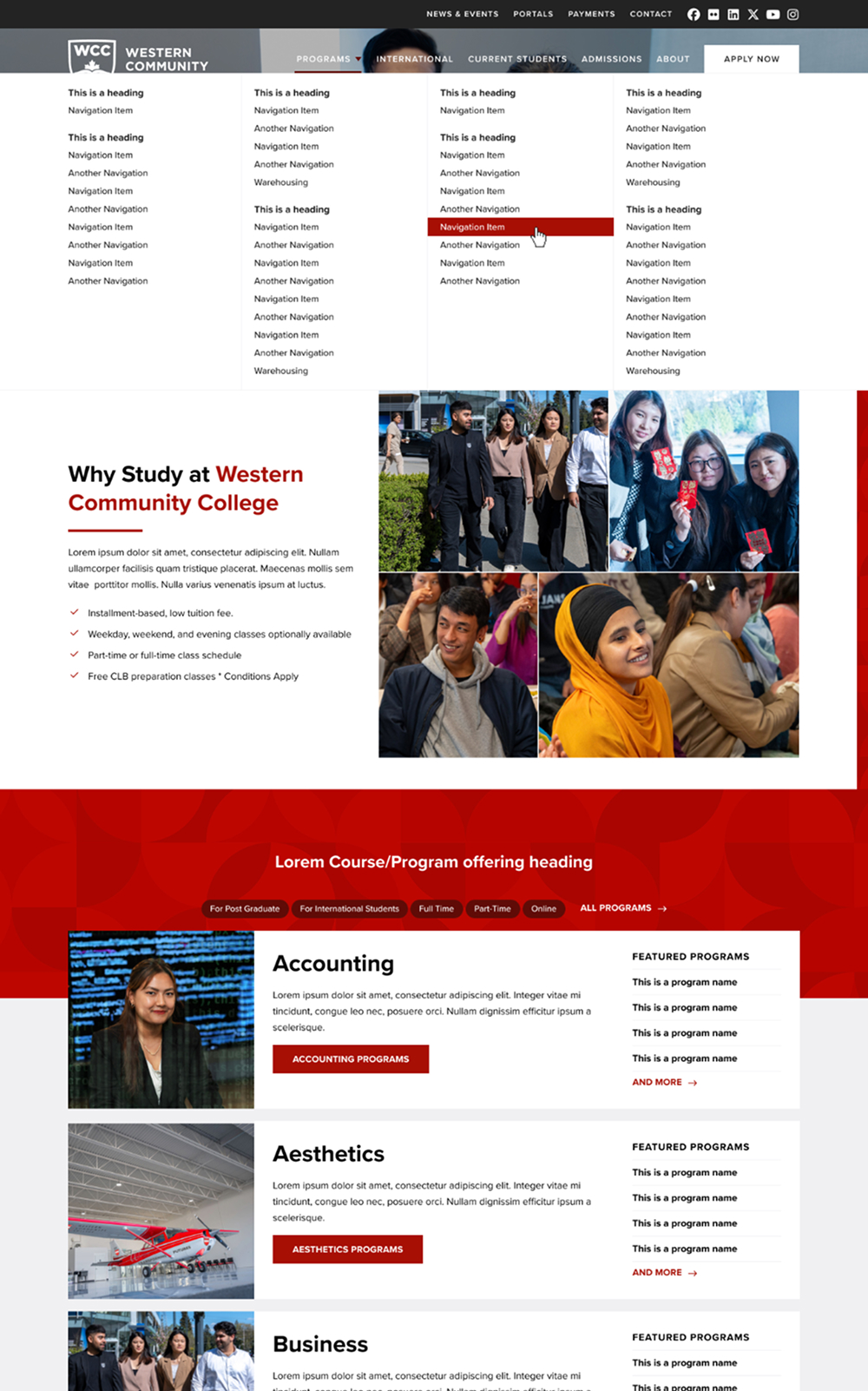 The focus of this website redesign was on smoother navigation and a cleaner presentation of information. This was especially important to support their many international students in quickly finding details about permit-eligible programs, credit transfers, and post-graduate pathways to work in Canada. Through our sitemap and wireframe work, we strategized the best way to make all of that content easily discoverable.