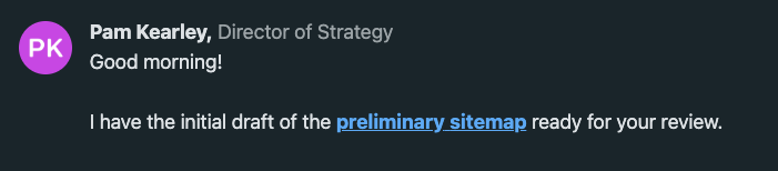We will share each Figma deliverable on Basecamp, in the Information Architecture, UX & Site Planning, and UI & Creative Design threads.