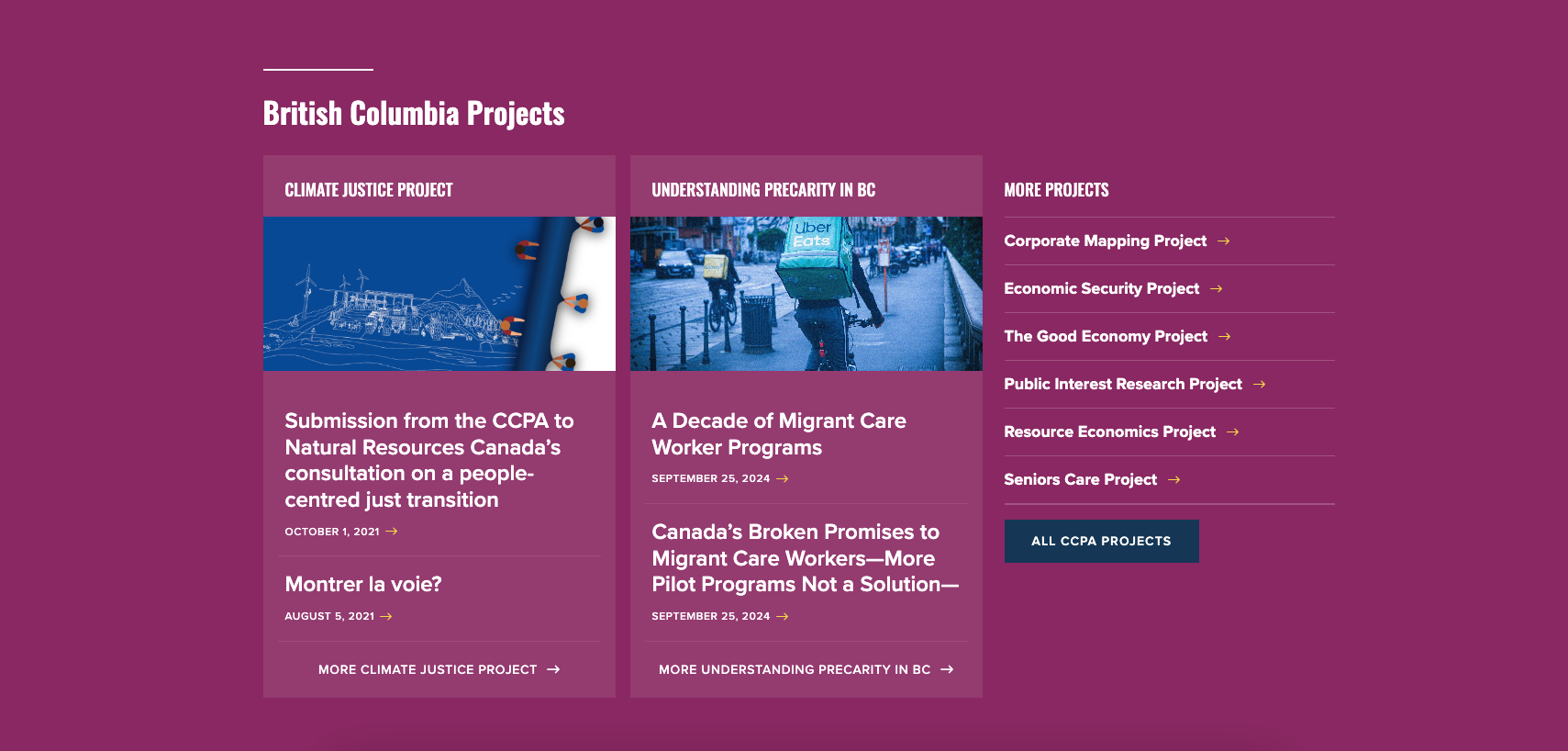 Query Blocks can easily be set up to be highly specific, which is done with taxonomies. Here’s an example where the Query Block is set to show the latest two projects, but only ones that have the “BC” term in the “Province” taxonomy.
