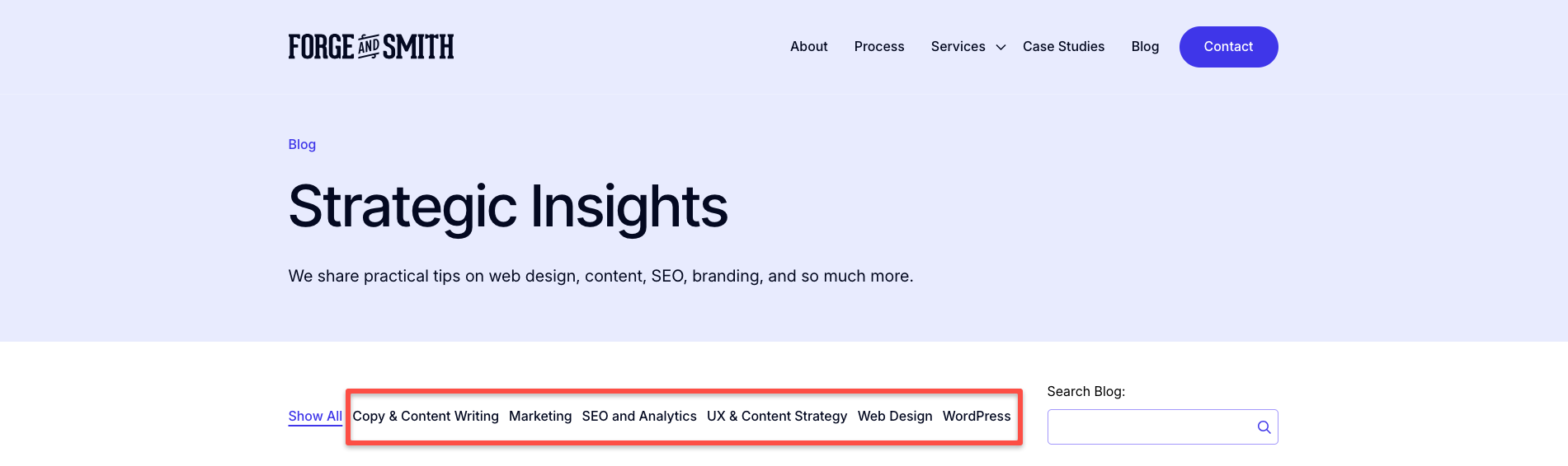 Sometimes simplicity is best. The Forge and Smith blog only uses categories.