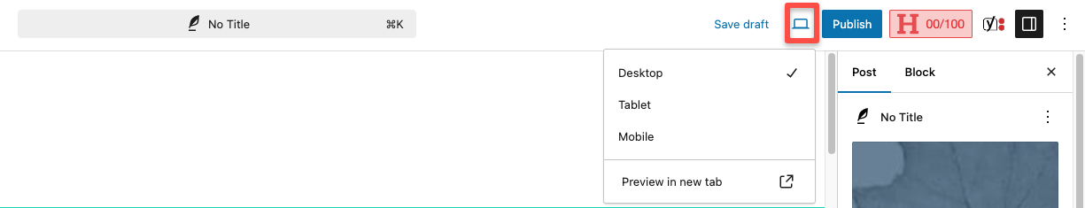 You can also preview your page or post without publishing it, by clicking the preview button in the top right area, and choosing to preview on desktop, tablet, or mobile: