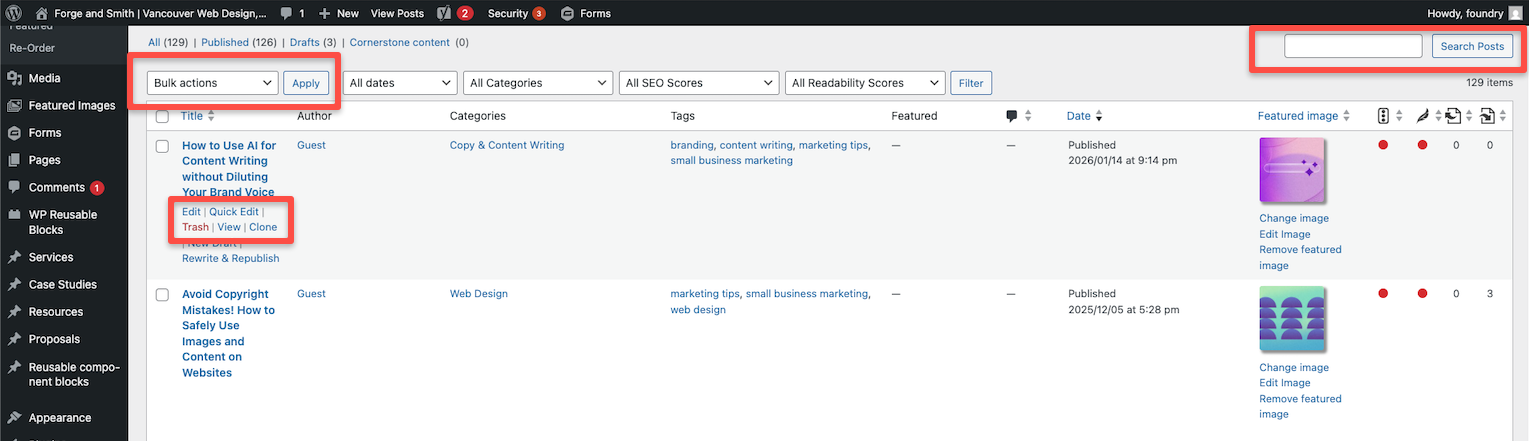 You can click to add a new post, search for a post using keywords, apply bulk actions to multiple posts (such as deleting or adding a new category), or hover over a post’s title to reveal a sub-menu.