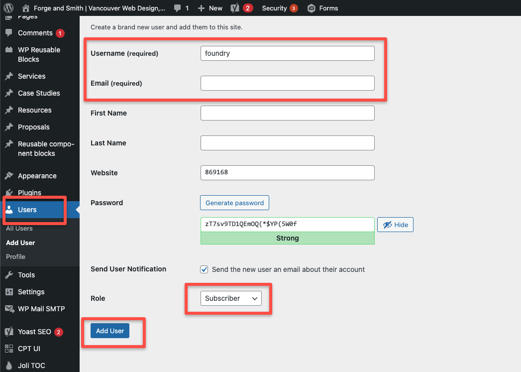 Administrators can add new users via the Users menu on the lefthand side and choosing “Add New User” at the top. This will open a set of fields to configure: