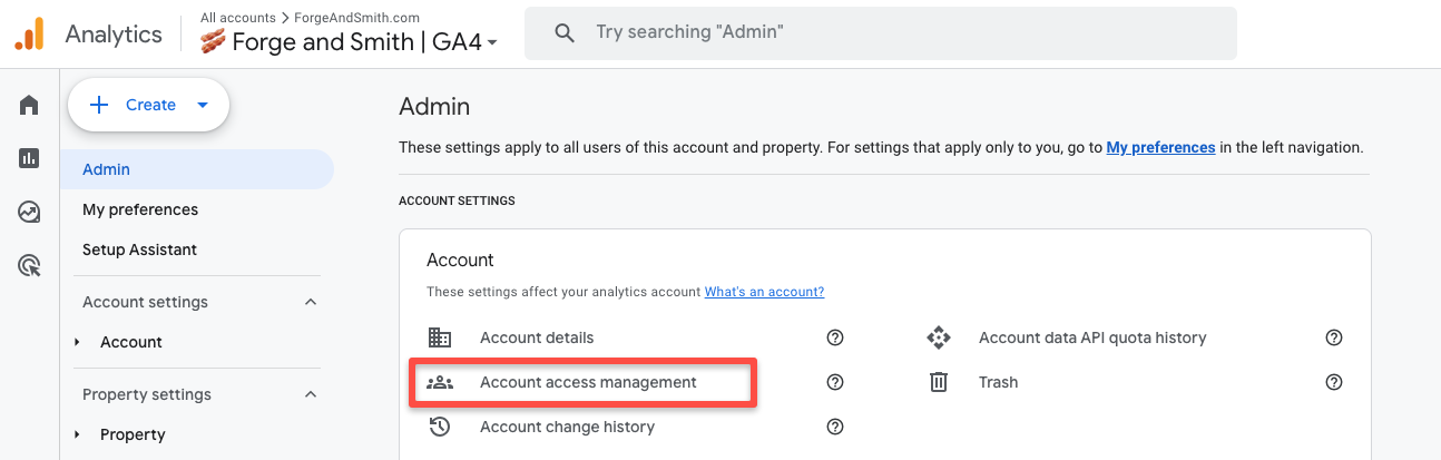 To add a new user, someone with admin access can visit the admin settings panel in the bottom left corner of GA4, and then choose Account access management