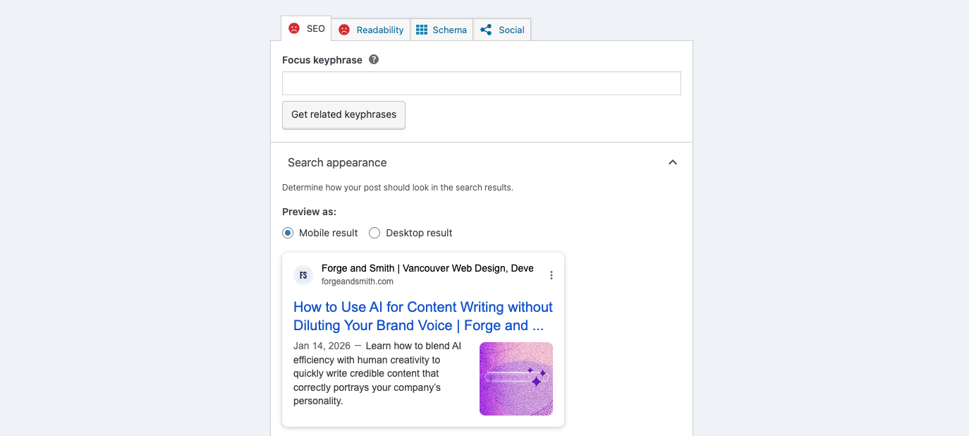 Focus keyphrase: This is where you can set a focus phrase for a page or post, ie. the keywords for which you want the page to rank. We (Forge and Smith) don’t configure these by default, because of how Yoast uses this to produce a set of (frequently outdated) suggestions. That’s why they are all red unhappy faces. In general, we recommend writing for humans first (not “for SEO”), and only adding keywords where they fit naturally.